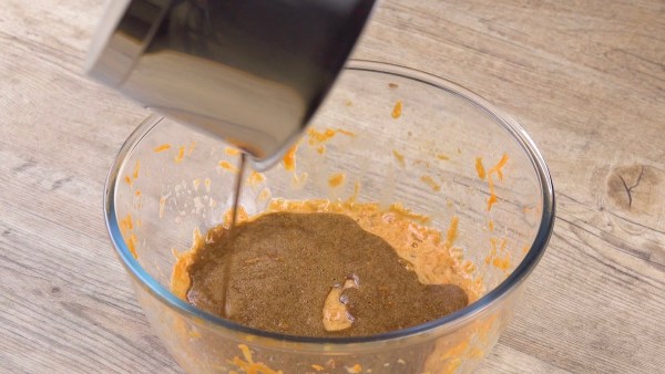 - Add the dog chocolate to the melted coconut oil in a heated pot, stir until smooth, and add to the carrot banana mixture.