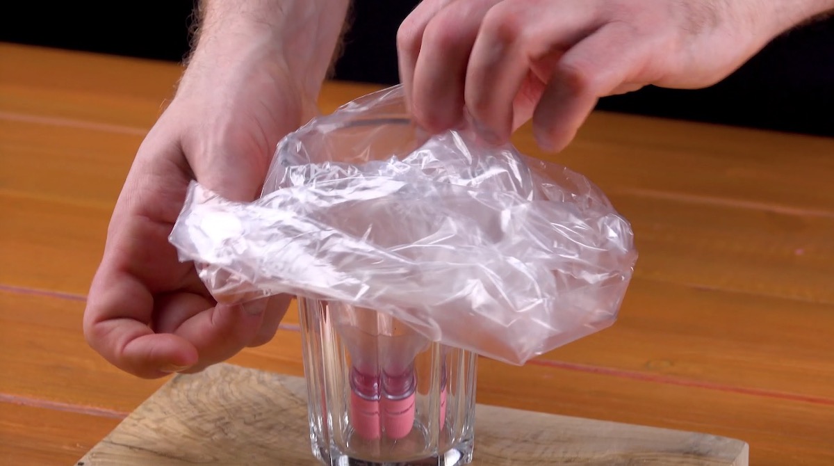 1.2 Next, cut the corner of a freezer bag and insert the the bottle through it. Place the DIY piping bag in a glass with the lid facing downwards.