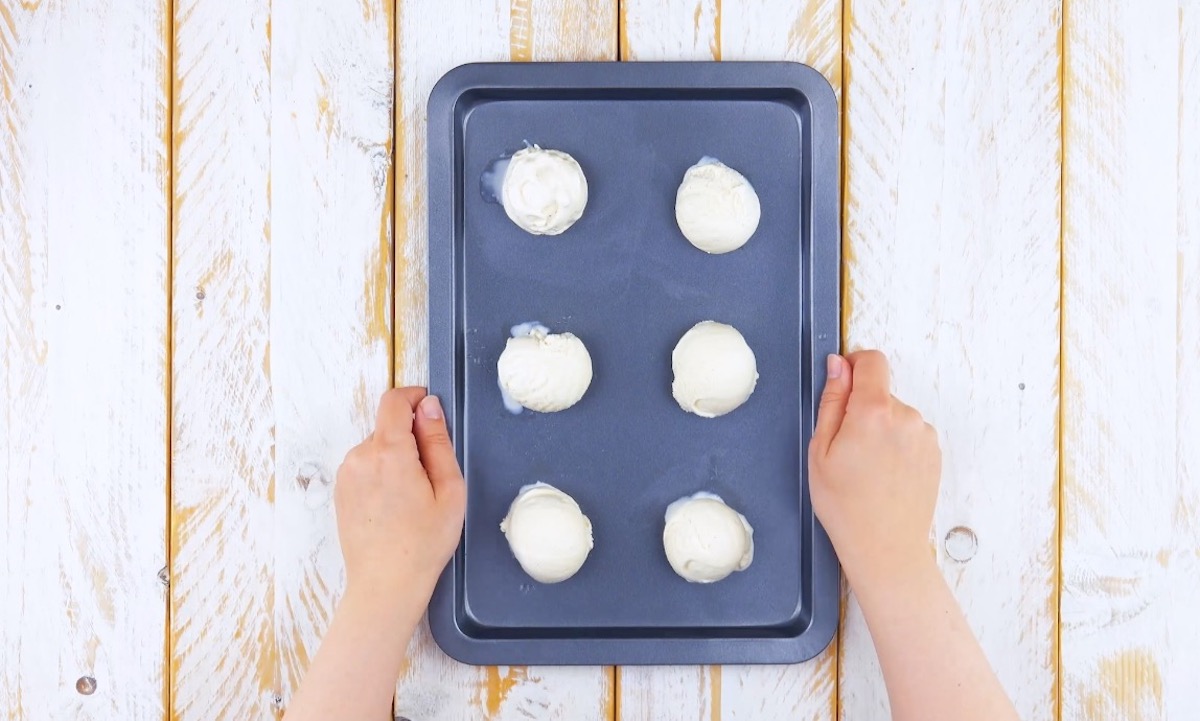 3.2 Place 6 scoops of vanilla ice cream on a tray and freeze them until they are solid.