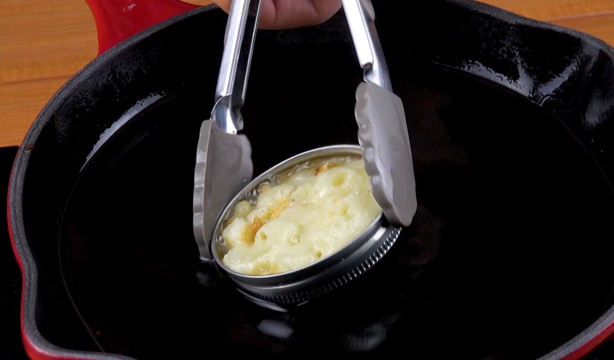 2.2 Heat up some oil in a pan and place a metal Mason jar lid in the center. Pipe some of the batter into the lid and flip it over with some tongs.