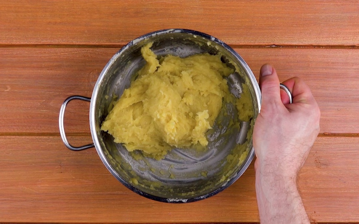 1.3 It’s now time to prepare the batter. First boil the water with butter and sugar. Add a pinch of salt and the flour to the mixture. Stir the batter until it loosens from the edge of the pan. Transfer the batter to a bowl, leave it to cool and add the eggs to it.