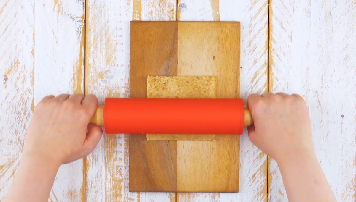 3.1 Remove the crusts from 12 slices of wholegrain bread and roll them out.