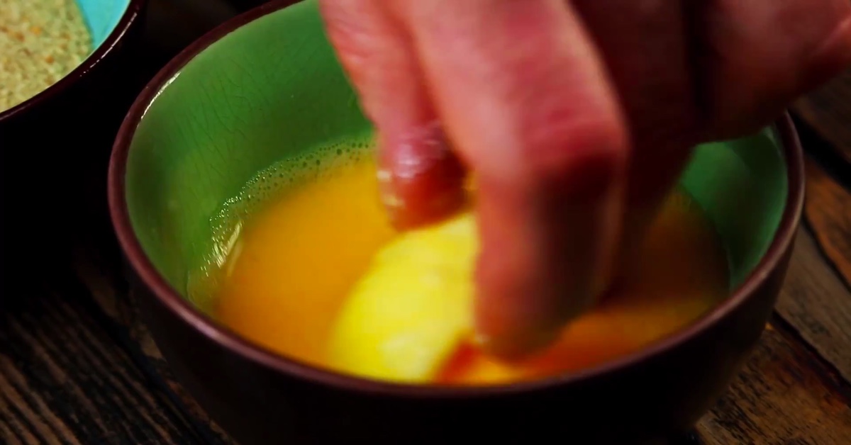 • While heating the oil, dip the egg whites in flour, beaten egg, and then breadcrumbs. When the oil is hot, fry the breaded egg whites until golden brown.