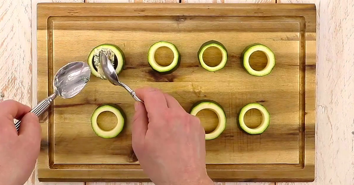 - Wash the zucchini, remove the ends and slice into eight thick circles. Remove the inner flesh from each, leaving a sturdy ring behind. Cut the center circles into small cubes.