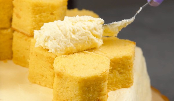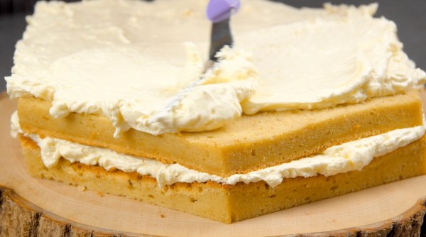 - Frost the top half of the cake with honey buttercream frosting, then place the bottom half of the cake on top. Cover the top and all of the sides of the layered cake with the frosting.