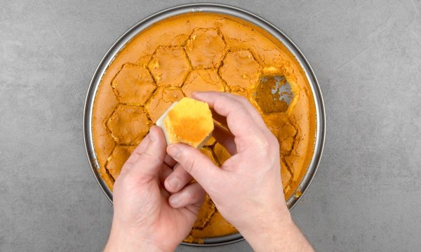 - Use the hexagon cookie cutter to cut the yellow chocolate into individual honeycombs and place them on top of the towers on the honeycomb tower cake. Drizzle some honey on top of the chocolate honeycombs and dig into this bee-utiful cake!
