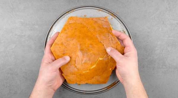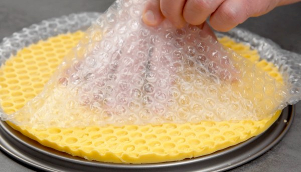 - Melt the white chocolate in a double boiler and stir in some yellow food coloring. Clean a large piece of bubble wrap thoroughly and secure it to the base of the springform pan. Pour the melted yellow chocolate on top of the bubble wrap, transfer the springform pan to the refrigerator, and let the yellow chocolate chill for 20 minutes. Once the yellow chocolate has set, carefully remove it from the springform pan, flip it over onto a clean work surface, and carefully peel off the bubble wrap.