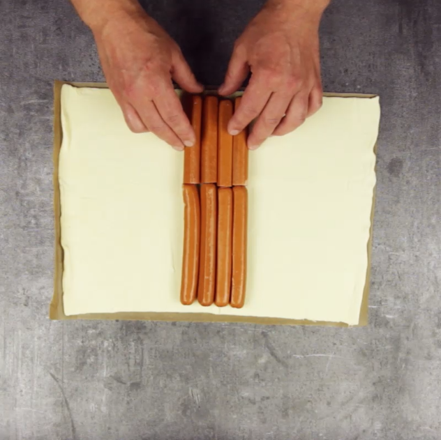 - Spread out the puff pastry and place the hot dogs in the center with four lined up next to each other and the other four on top of them.