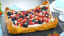 • Once the cake has cooled, remove the chilled yogurt mixture from the refrigerator and carefully fold in the whipped cream. For the strawberry compote, stir together the quartered strawberries and strawberry jam, then spoon the compote into the crevices in the cake. Cover the layer of strawberry compote with a generous layer of vanilla yogurt mousse. Add a layer of fresh mixed berries and toasted sliced almonds on top.