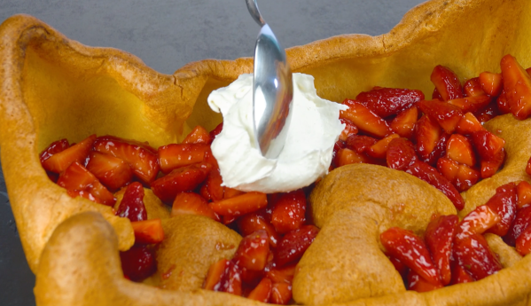 This cake’s textures and flavors are out of this world. Watching the craters bubble up in the oven is a sight to behold, but the best part is filling in those gaps with delicious strawberry compote and creamy vanilla yogurt mousse. Wait, we take that back – the best part is definitely taking that dreamy first bite!