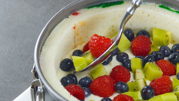 - Chop the kiwis, then stir together the blueberries, raspberries, and chopped kiwi. Fill half of the springform pan with the cheesecake filling, then spoon the mixed fruit on top.