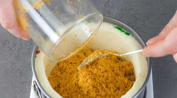 - Crush the graham crackers and stir them together with the melted butter. Press the mixture into the base of the springform pan using the bottom of a glass, then transfer the springform pan to the refrigerator and chill for 30 minutes.