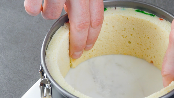 - Mix together the cream cheese and the sweetened condensed milk. Add in the lemon juice and fold in the whipped cream. Line the ring of a 7-inch springform pan with the 2 rectangular pieces of mosaic cake.