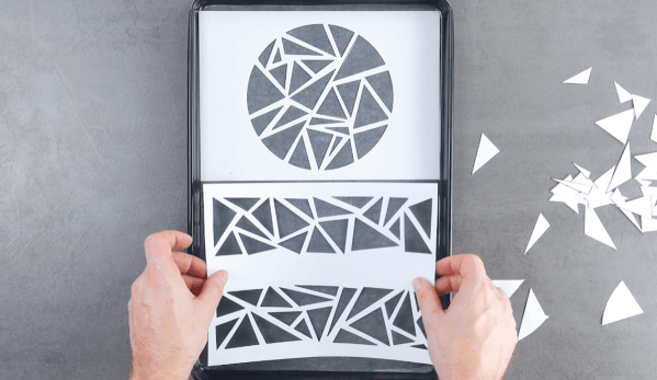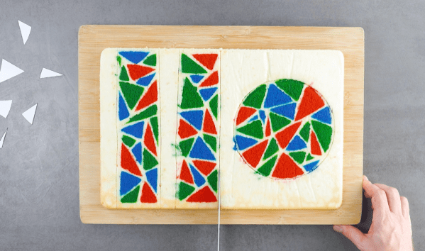 - Pipe the colorful batter into the empty triangles cut out of the stencils, then carefully remove the stencils. Transfer the baking tray to the refrigerator and chill for 30 minutes. Preheat the oven to 350°F. Pour the sponge cake batter onto the baking tray, making sure it covers the colorful cake batter completely. Transfer the baking tray to the oven and bake the mosaic cake at 325°F for 27 minutes. After the mosaic cake has baked, carefully flip the baking tray over onto a clean work surface and peel off the parchment paper. Cut the 2 rectangular pieces and 1 circular piece of colorful mosaic cake out.