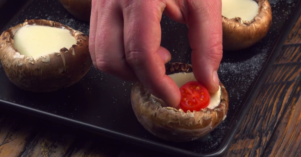 - Turn the caps and fill with a thick slice of mozzarella and a few slices of tomato. Bake for 20 minutes at 350 °F.