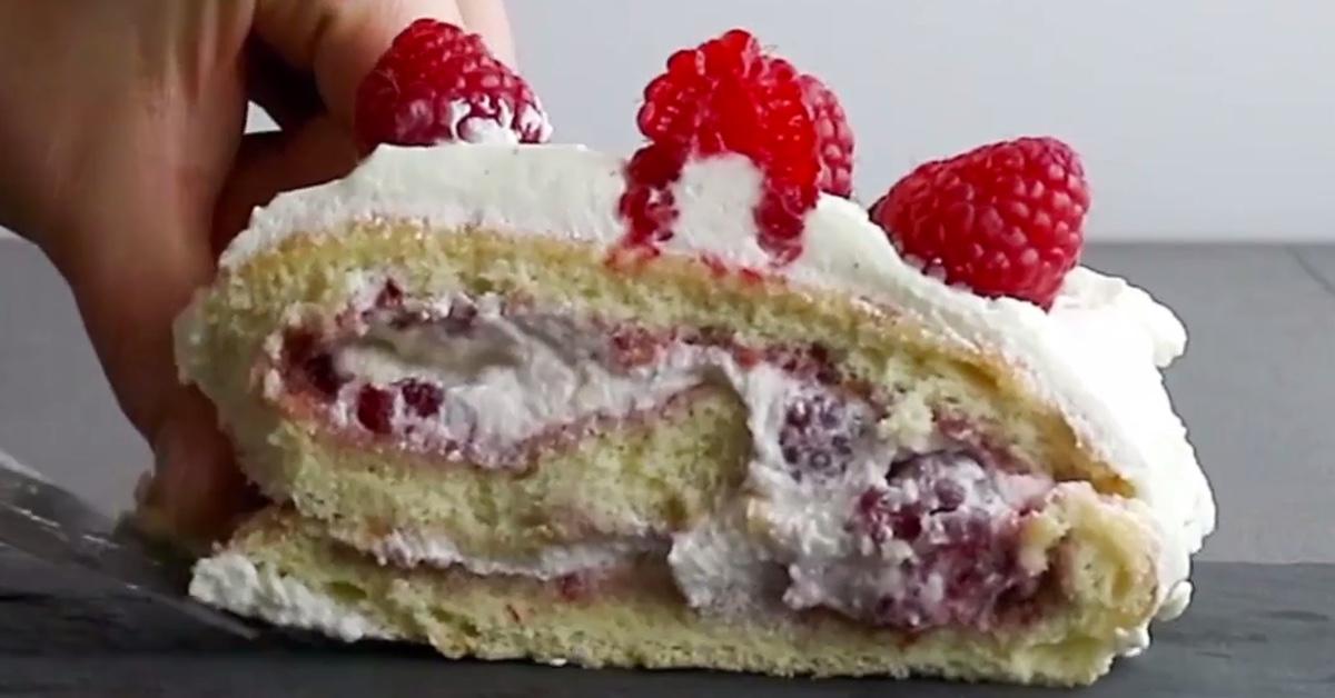 - Beat cream, powdered sugar, and vanilla extract until stiff. Spread over the roll and garnish with fresh raspberries.