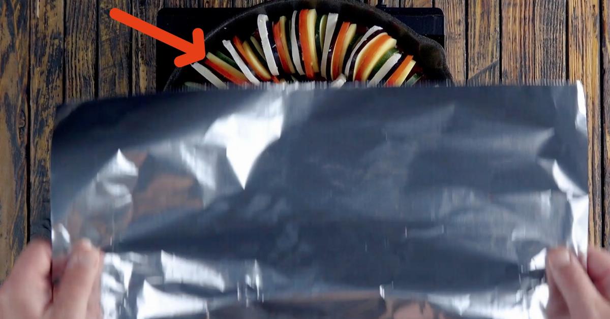 • Take one slice of each of the sliced ingredients from Step #1 and place them upright and next to each other around the outer edge of the pan. Repeat this until you have filled the outer edge with a complete circle, and then continue with a smaller circle inside. Repeat until the entire pan is full.