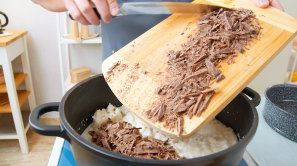 • For the chocolate rice pudding, add the uncooked rice, milk, and sugar to a pot over medium heat, stir to combine, and cook for 20 minutes. Add the chopped chocolate to the rice pudding in the pot and stir until it has completely melted.