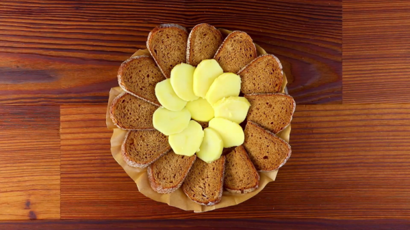 - Place two slices of bread on the bottom of the pan before adding half slices along its edge. Then place slices of potato on the bottom of the pie.