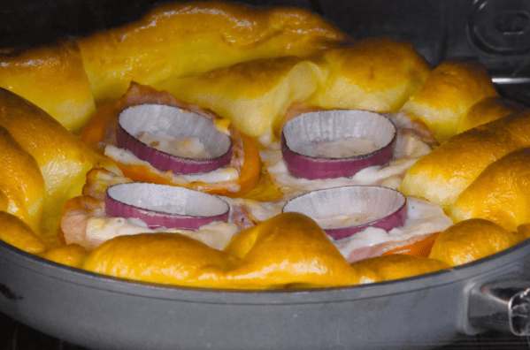 • Coat a 13-inch oven-safe frying pan with vegetable oil and place it in the oven for 15 minutes. Once the frying pan is hot, carefully remove it from the oven, pour in the Yorkshire pudding batter, and arrange the stuffed bell pepper rings on top. Transfer the frying pan back to the oven and bake the Yorkshire pudding at 425°F for at least 30 minutes, until the Yorkshire pudding has risen.