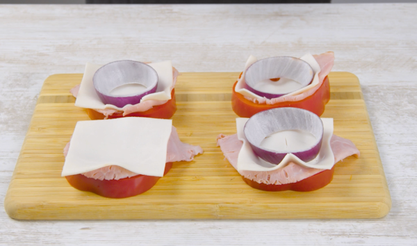 • Preheat the oven to 425°F. For the Yorkshire pudding, combine the eggs, flour, milk, and salt in a large mixing bowl and stir everything together until a smooth batter forms. Once combined, let the batter rest for 15 minutes. Slice the red onions into large rings and remove the seeds from the bell peppers and cut them into 4 equally sized rings. Place 1 slice of ham, 1 slice of cheese, and 1 slice of red onion inside each of the bell pepper rings.