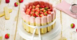 - For the first part of the decoration, cover the cake evenly with more whipped cream that has been beaten until it is stiff. Melt the white chocolate over a water bath and dye it with some food coloring to produce a baby pink color. Dip the ladyfingers about a quarter of the way into the chocolate and then let dry. For this, you can stand the ladyfingers in cups, glasses, or even an ice cube tray in the fridge. Place the cookies with the hardened chocolate around the edge of the cake until it is completely covered. Then decorate the top with strawberries and some mint leaves.
