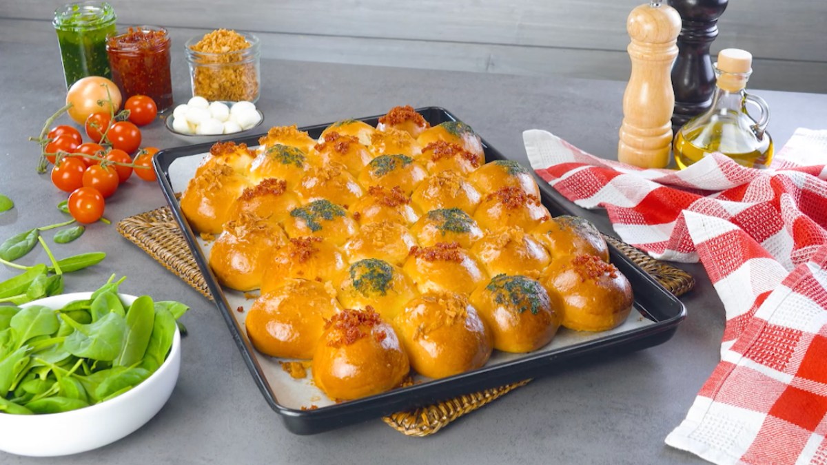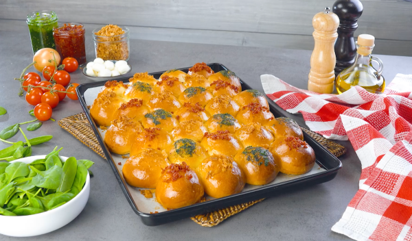 - Brush the egg wash over the buns, transfer the baking tray to a preheated oven set to 325°F, and cook for 20 minutes. After 20 minutes, top the caprese buns with red pesto, top the weenie buns with crispy fried onions, top the feta spinach buns with basil pesto, and bake for another 5 minutes. If the buns start to brown too much, simply cover the baking tray with aluminum foil.