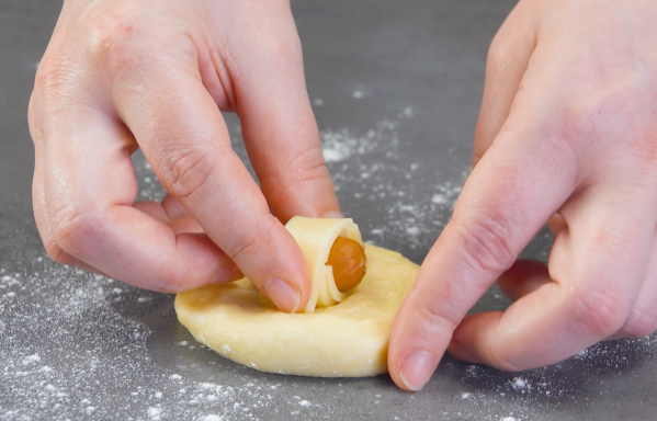 - Roll a thin strip of cheese around a cocktail sausage, place it on the dough, fold the dough around the filling to form a ball, and transfer the stuffed dough ball to the baking tray.