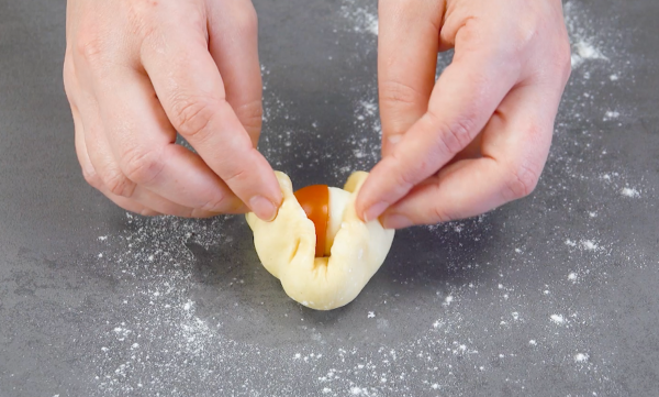 - Press a mozzarella pearl and half a cherry tomato together, place it on the dough, and fold the dough around the filling to form a ball. Transfer the stuffed dough ball to a baking tray lined with parchment paper.