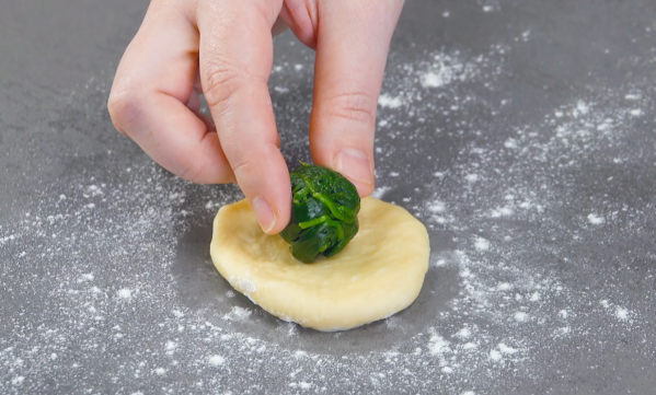 - Wrap some cooked spinach around a feta cheese cube, place it on the dough, fold the dough around the filling to form a ball, and transfer the stuffed dough ball to the baking tray. Repeat the process with the rest of the yeast dough and fillings and arrange the stuffed dough balls in an offset pattern on the baking tray. Cover the baking tray with plastic wrap and let the dough balls rise for another 30 minutes.