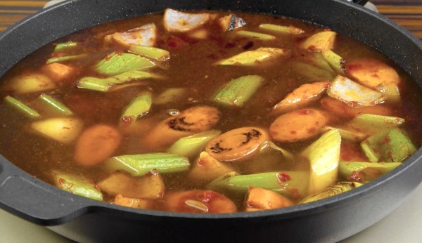 - For the sauce, heat some olive oil over medium heat in an oven-proof skillet and sauté the chopped vegetables. Add the tomato paste and sugar and cook everything together briefly. Pour in the red wine and let it reduce by about half. Add the broth and let the sauce come to a boil.