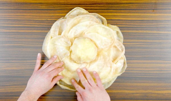 - Starting with the innermost leaves, coat each cabbage leaf with a thin layer of the ground beef filling and push the coated cabbage leaf against the core in the center. Continue coating the cabbage leaves and folding them back up, working from the inside out.