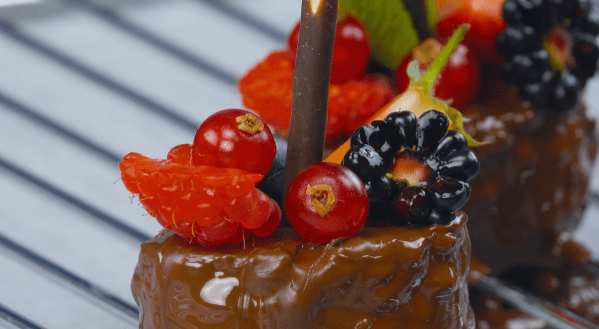 - Melt the semi-sweet chocolate over a double boiler and cut ovals out of the orange cake using the cookie cutter. Pour the melted semi-sweet chocolate over the pieces of cake. Decorate the chocolate-covered pieces of cake with fresh berries and insert 1 Pocky Stick into each piece. Let the chocolate set for 30 minutes.