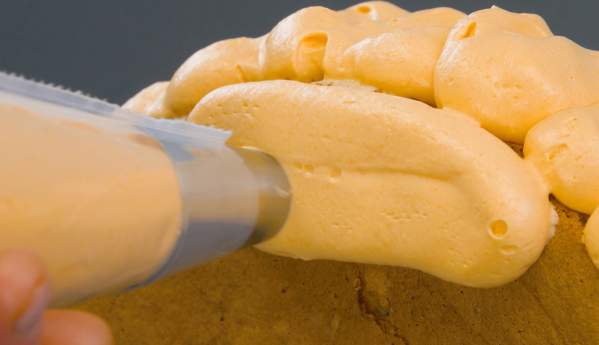 - For the orange buttercream frosting, beat the butter, then pass the powdered sugar through a fine sieve directly into the same bowl. Beat the mixture until the sugar has dissolved, then add in the cream cheese, orange syrup, and food coloring. Place the half of the cake you set aside earlier upright on a glass plate or cutting board. Transfer the orange buttercream frosting to a pastry bag and cover the cake with frosting. Pipe some additional frosting in a zig-zag pattern onto the glass plate or cutting board in front of the orange cake so that it looks like a reflection.