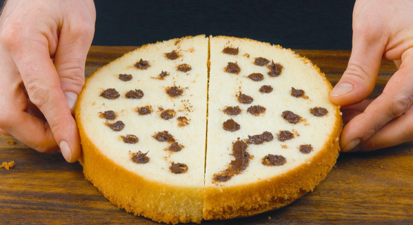 - Cut the orange cake in half, making 2 semicircles, and set 1 half aside for later. Cut the other semicircular piece in half horizontally, then position the 2 semicircular halves next to each other so that they make a full circle again.