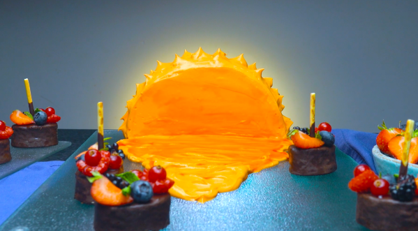 - Drip small amounts of red food coloring onto different places in the buttercream frosting and use a spoon to spread the colored frosting around so that it looks like a sunset. Use the spoon to shape the orange buttercream frosting into small peaks around the outer edge of the cake so that they look like the rays of the sun. Transfer the cake to the refrigerator and let it chill for 30 minutes. Position the chocolate boats on the glass plate or cutting board so that they look like boats floating around in the sea.