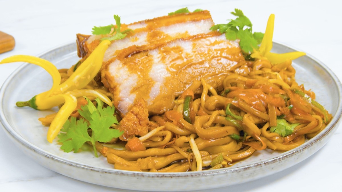 • Cut the pork belly into individual strips and serve with the teriyaki stir fry and homemade noodles. Garnish with chili peppers and cilantro before serving.